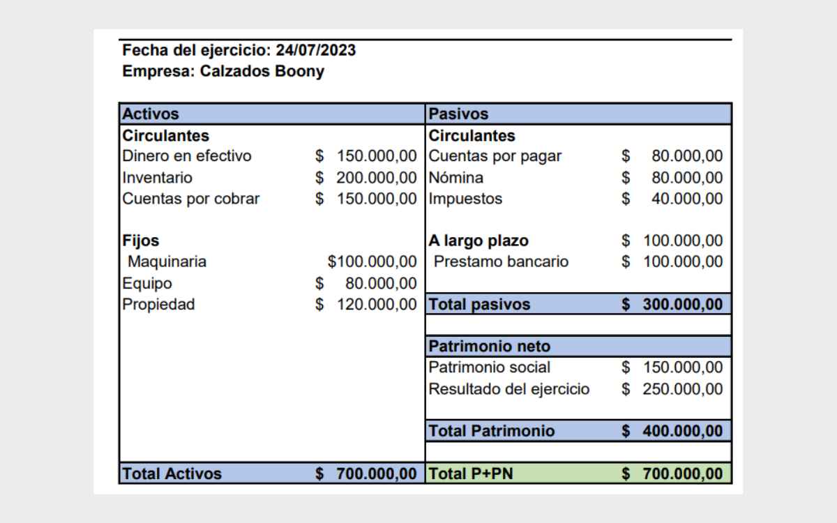 Este ejemplo muestra claramente cómo los activos de la empresa están financiados tanto por deudas como por el patrimonio de los propietarios, manteniendo el equilibrio entre ambos lados de la hoja de balance. Recordando siempre verificar que los totales de ambos lados coincidan, asegurando la precisión de la información financiera presentada.
